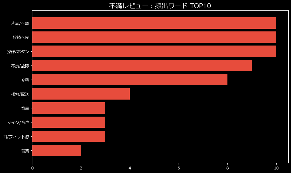 不満カテゴリ内訳を見ると、品質/初期不良が20件、使用感/効果が12件。配送やコスパへの不満は微々たるもので、要するに「ショップの対応や配送スピード以前に、モノそのものが機能していない」という、ガジェットとして致命的な状況が浮かび上がってきました。