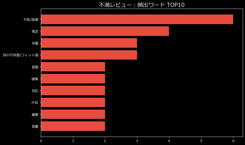 まず、不満カテゴリの圧倒的1位は「品質/初期不良」です。これが全体の約3割以上を占めているという事実は、もはや「個体差」という言葉で片付けるには無理があります。さらに、頻出単語ランキングを見ると、「不良/故障」がトップに君臨し、それに続くのが「残念」「後悔」「最悪」といった、もはや呪詛のような言葉たちです。