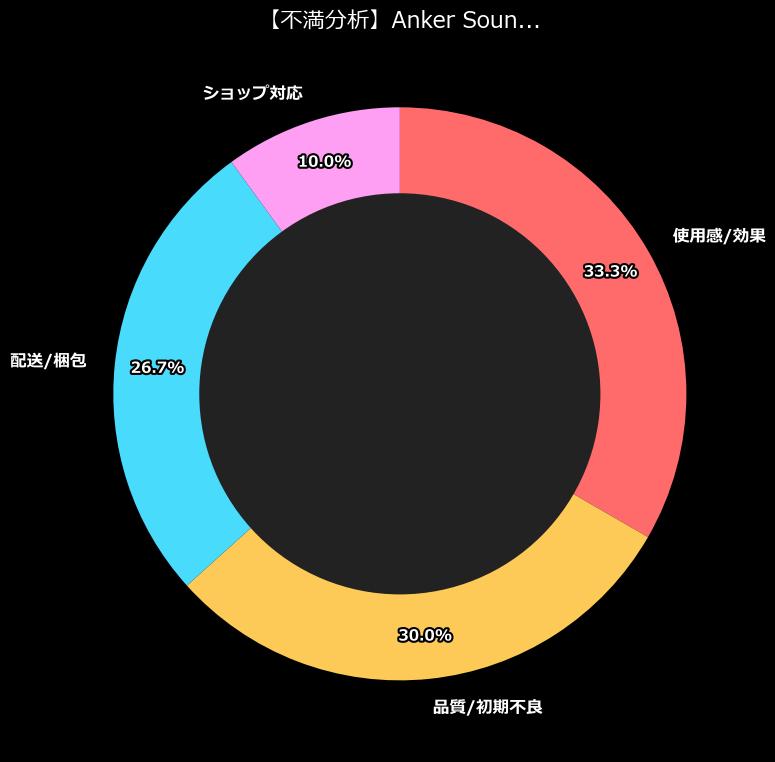 最も多い不満は「使用感/効果」の10件。続いて「品質/初期不良」が9件、そして意外にも多いのが「配送/梱包」の8件です。この数値が何を示しているか。それは、この商品が「期待値に対して、実力が追いついていない」、あるいは「品質管理と流通に深刻なバグがある」ということです。