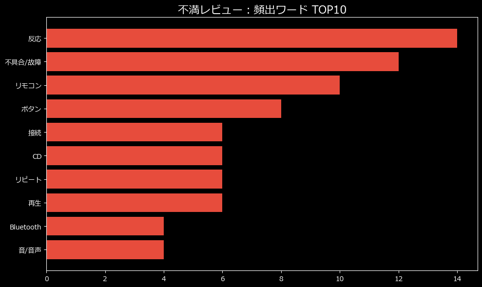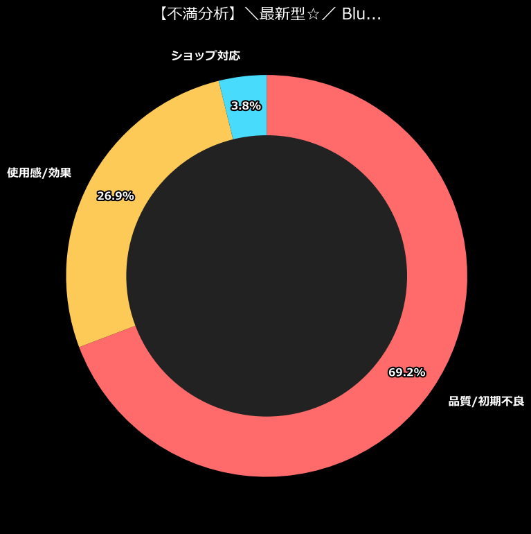 まん花が独自に収集した分析データによれば、この商品に対する不満の圧倒的1位は「品質/初期不良」。なんと、不満カテゴリ全体の約7割を占めています。