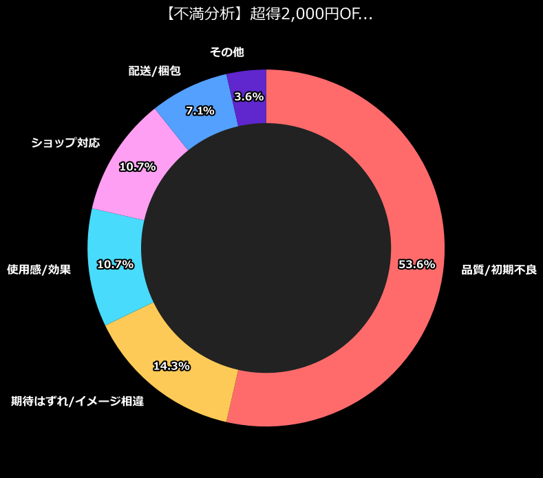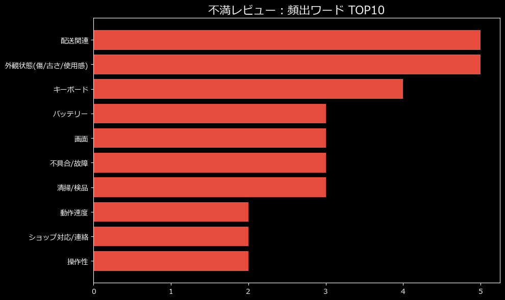 この商品の不満カテゴリを分析すると、「品質/初期不良」が圧倒的多数を占めていることが判明しました。