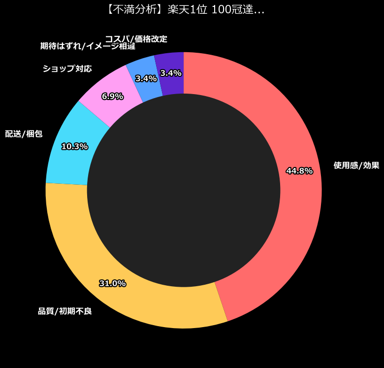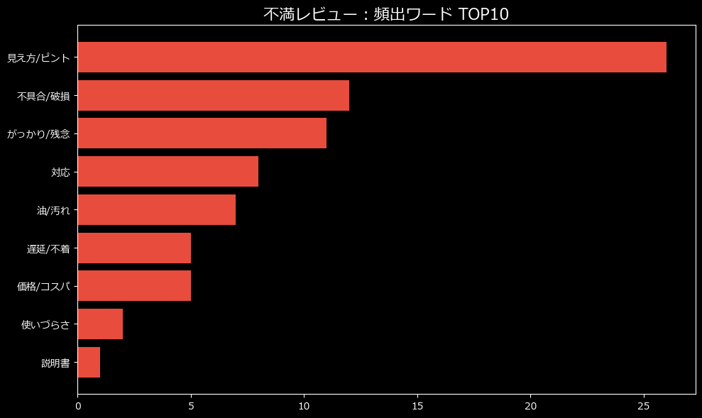 不満カテゴリの内訳を見ると、もっとも多いのが「使用感/効果」で13件。次いで「品質/初期不良」が9件。これ、ガジェットブロガーとしての直感ですが、かなり危険なサインです。なぜなら、「使いにくい」とか「効果がない」という不満は、その商品の根本的な設計ミスを示唆しているからです。