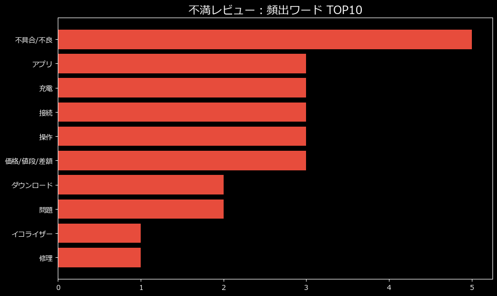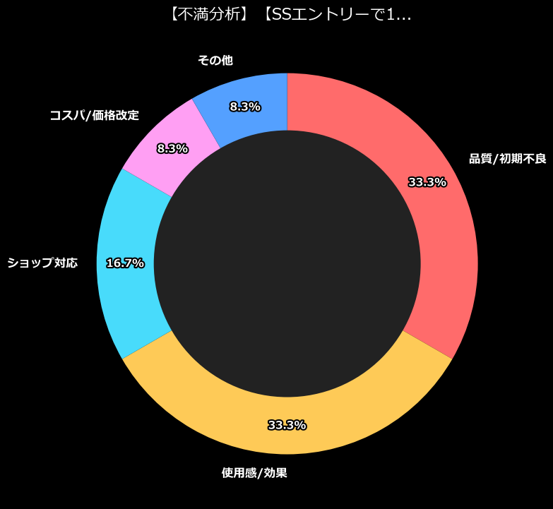 まず、不満のカテゴリ内訳を見て驚きました。最大の不満は「品質/初期不良」と「使用感/効果」。これらが同率1位です。これはどういうことか。つまり、「届いてすぐに壊れているか、あるいは使ってみたら期待外れだった」という、購入者にとって最も避けたい二択を迫られているようなものです。