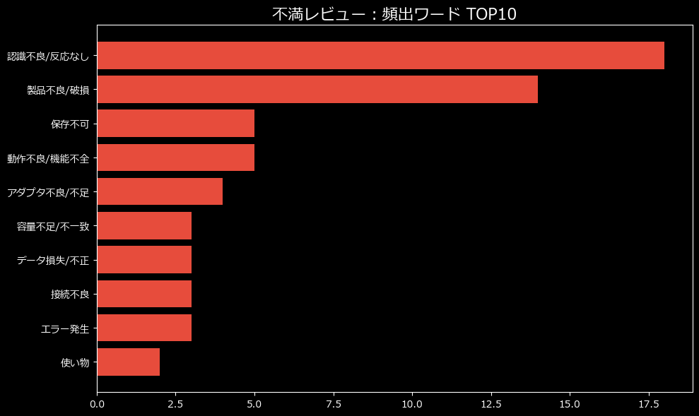頻出単語ランキングで圧倒的1位に輝いた「認識不良/反応なし(18回)」。これこそが、この商品を象徴するキーワードです。