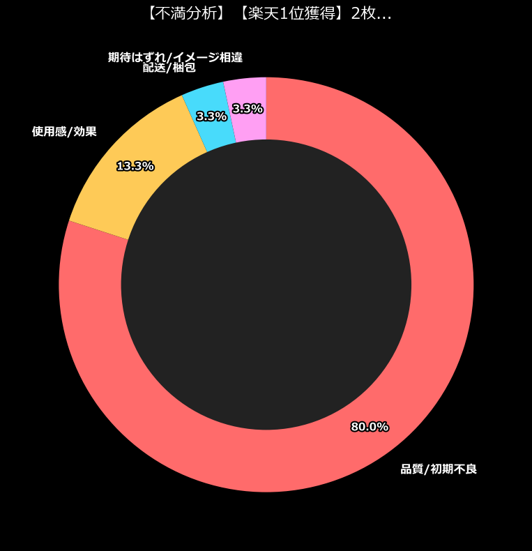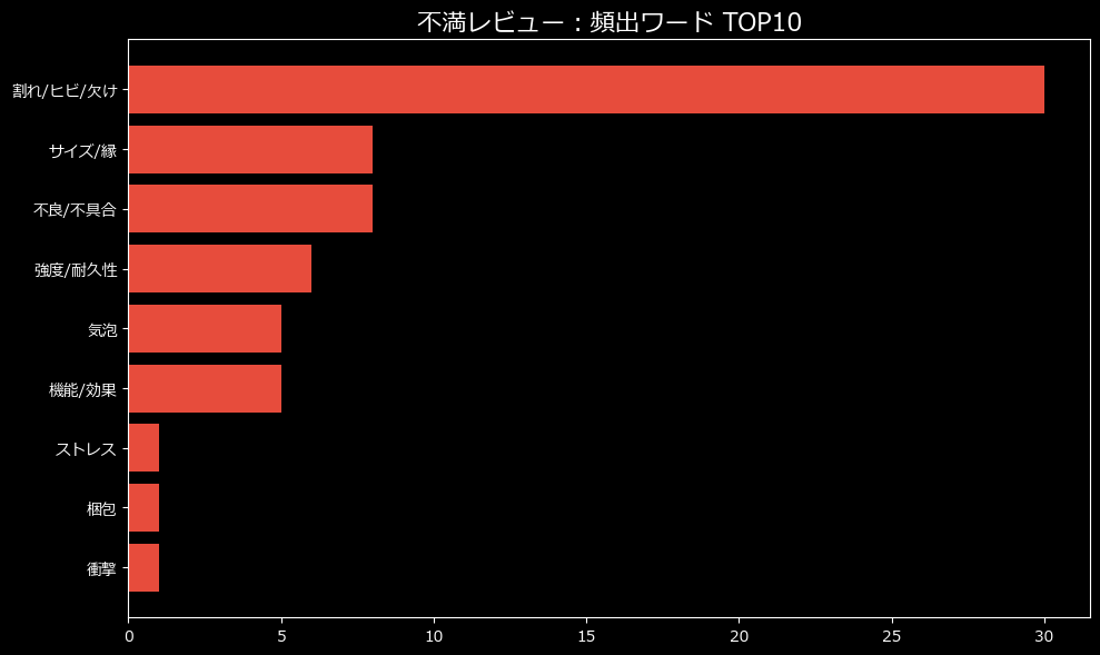 驚くべきことに、不満の約8割(24件)が「品質/初期不良」に集中しています。これは、製品が手元に届いた瞬間、あるいは使用を開始した直後に、ユーザーの期待が木っ端微塵に打ち砕かれていることを示唆しています。