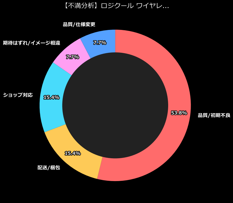 不満カテゴリの内訳を見ると、圧倒的首位に君臨するのが「品質/初期不良」です。全体の約半数以上が、手元に届いた瞬間に「あ、これ終わったわ」と確信するような事態に遭遇しています。