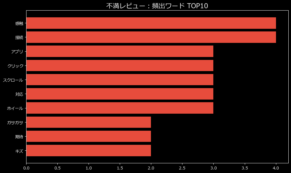 分析データを見て驚きました。最大不満カテゴリは、ズバリ「使用感/効果」です。全体の不満のうち11件が、実際に触れた際の手触りや挙動に集中しています。これは、製品が「動かない」といった単純な故障よりも、「使っていて不快である」という、感性に関わる致命的な問題が根底にあることを示唆しています。