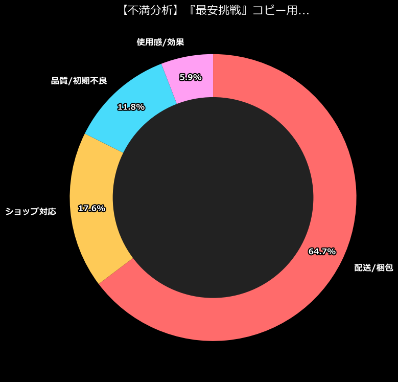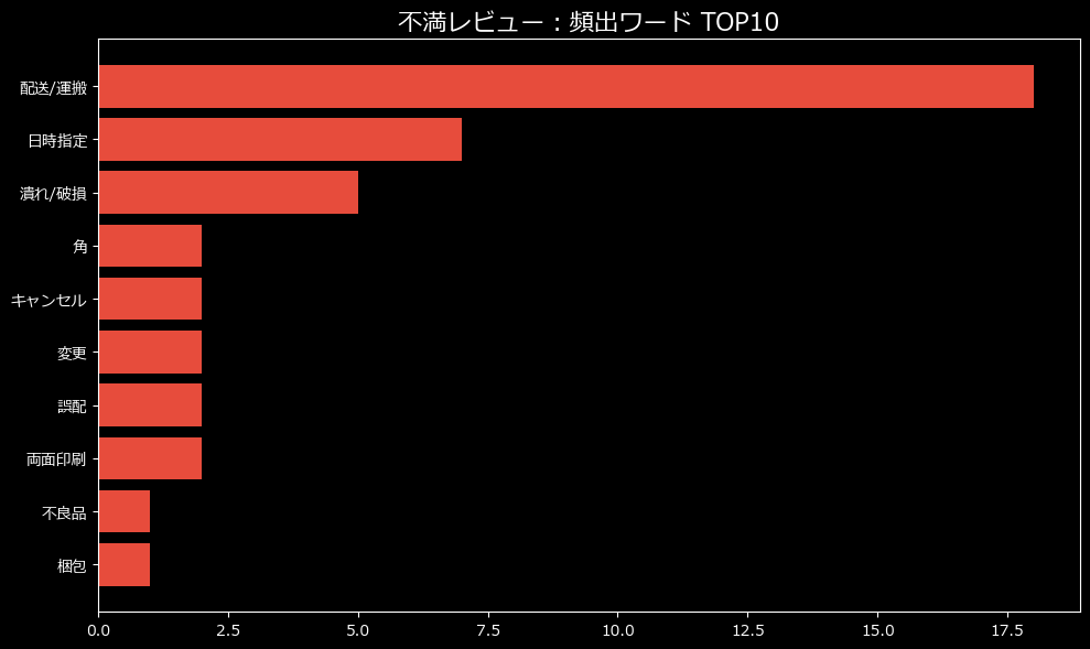 不満の内訳をご覧ください。「配送/梱包」に関する不満が11件と、断トツのトップ。もはや商品そのものの品質云々の前に、「まともに届くかどうかの戦い」が始まっていることがわかります。