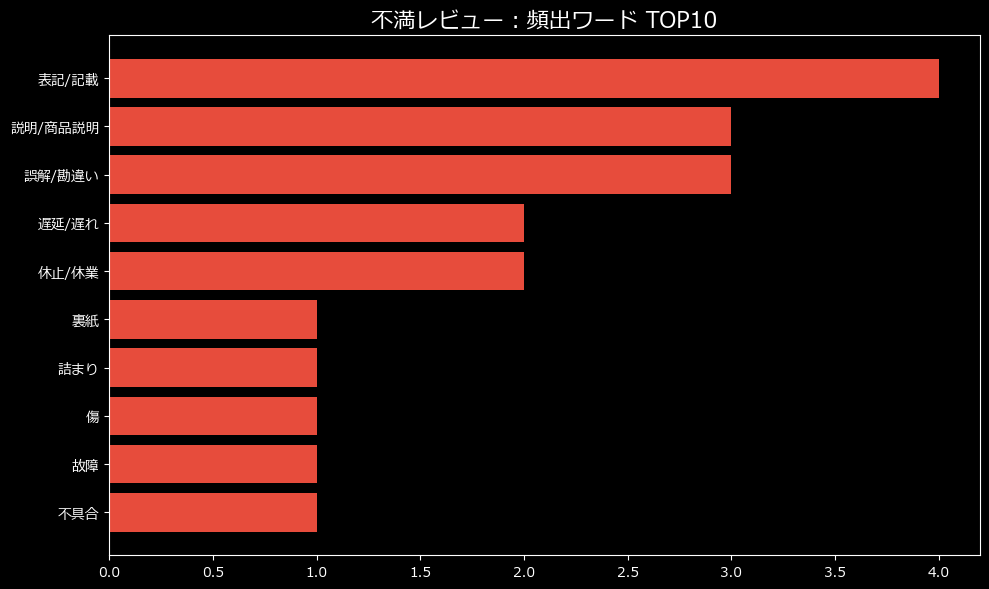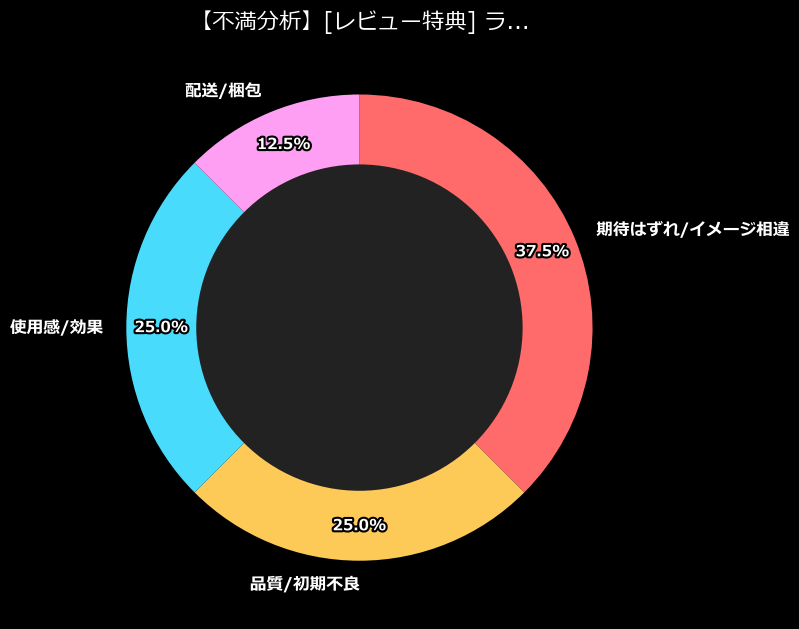 不満カテゴリの内訳を見ると、トップは「期待はずれ/イメージ相違」で、全体の約37%を占めています。次いで「品質/初期不良」「使用感/効果」が同率で並ぶという結果に。これ、どういうことか分かりますか?