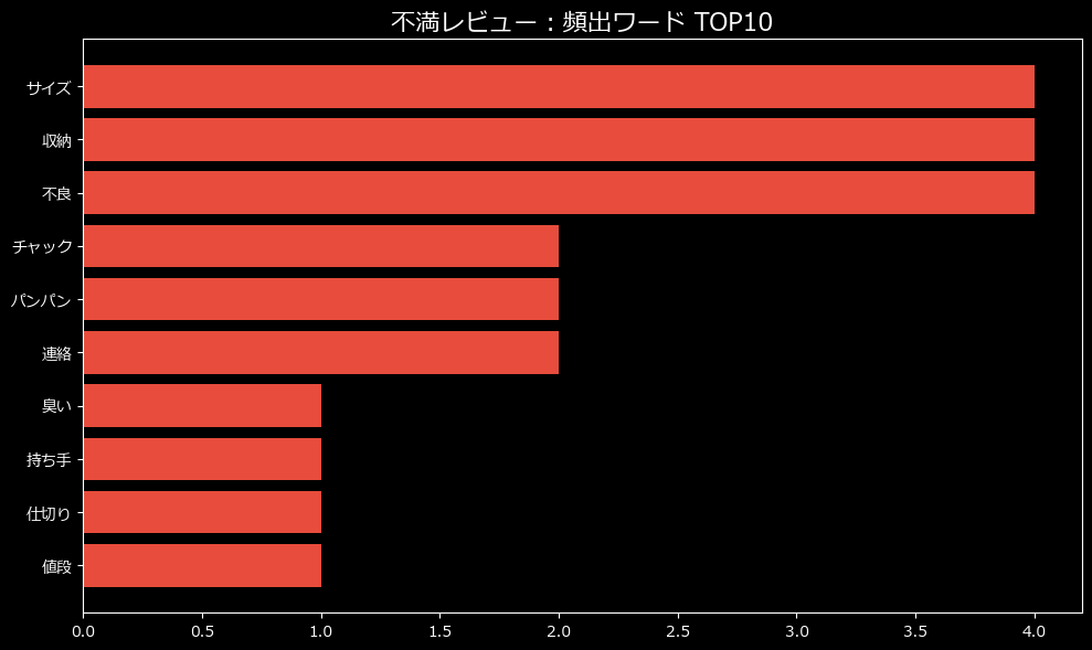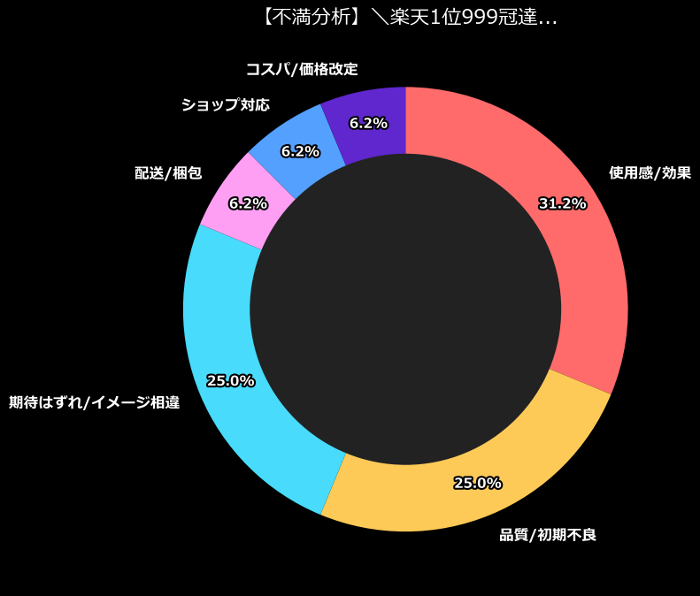 不満の最大の要因は「使用感/効果」に集約されています。これは、商品が届いて実際に使い始めた瞬間に、「あれ?思ってたのと違う……」という違和感に襲われる人が多いことを示唆しています。また、品質や初期不良、イメージとの相違も僅差で続いており、「期待値の高さ」と「実物のクオリティ」の間に、深い溝が存在していることは否定できません。