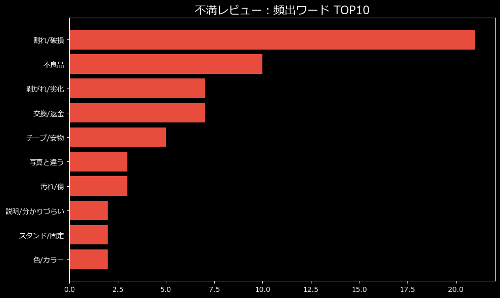 第1位は圧倒的で「割れ/破損(21回)」。第2位は「不良品(10回)」。