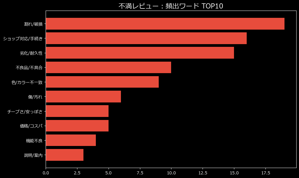 最大の不満カテゴリは、全体の圧倒的多数を占める「品質/初期不良」です。22件という数字は、ただの「ハズレ」で済まされるレベルではありません。これはもはや、「品質のロシアンルーレット」と言っても過言ではないでしょう。