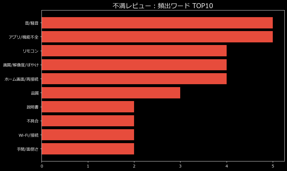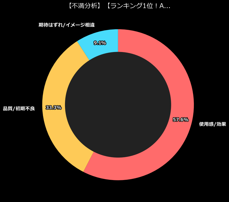 まず不満のカテゴリ内訳を見ると、「使用感/効果」が19件と圧倒的です。これは要するに、買ったはいいけれど「期待したように動かない」「使い勝手が悪い」と感じている人が多いということ。さらに「品質/初期不良」が11件。1万円という安価な商品とはいえ、一定数が文鎮を掴まされている現実は無視できません。