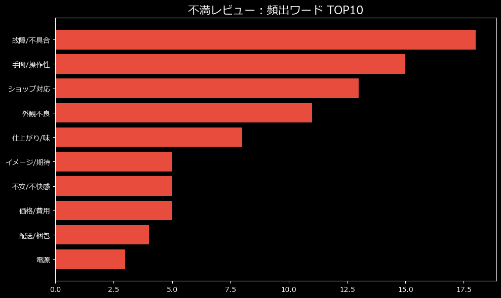 この商品の最大の問題点は、もはや隠しようがありません。「品質/初期不良」が22件。不満カテゴリの中でもダントツのトップです。全不満レビューの約3分の1が、使う前から、あるいは使い始めてすぐに「絶望」を味わっているという異常事態です。