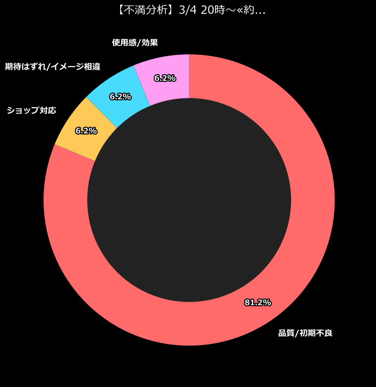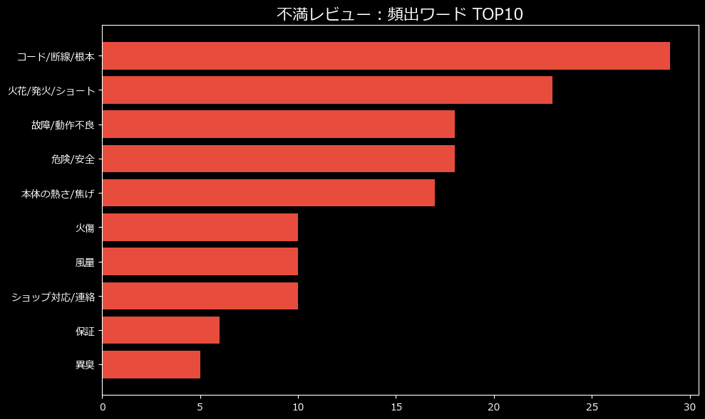 不満カテゴリの圧倒的1位は「品質/初期不良(26件)」。ショップ対応やイメージ相違といった些細な不満を置き去りにして、圧倒的なパワーで「モノそのもののヤバさ」が主張されています。これは、単なる「相性の悪さ」で片付けられるレベルではありません。