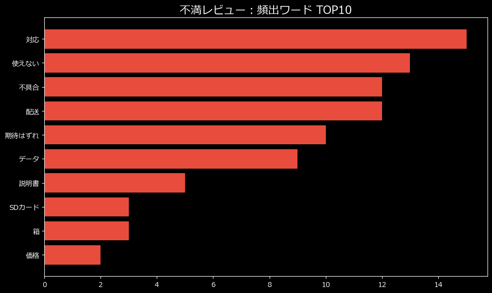 不満カテゴリの断トツ1位(13件)を占めるのが「品質/初期不良」です。