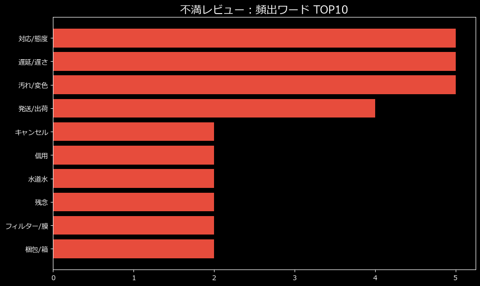 分析データを見てまず驚くのは、その不満の矛先です。商品そのものへの文句よりも、「ショップ対応(9件)」と「配送/梱包(7件)」という、購入プロセスにおけるトラブルが圧倒的多数を占めているのです。これはもはや、浄水器のレビューではなく「配送業者と事務局への苦情申し立て」の場と化しています。