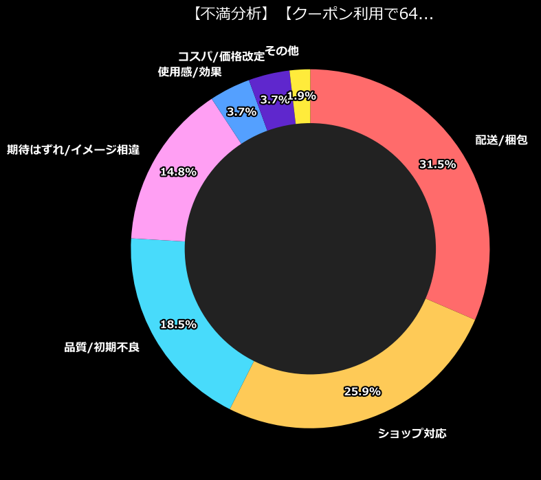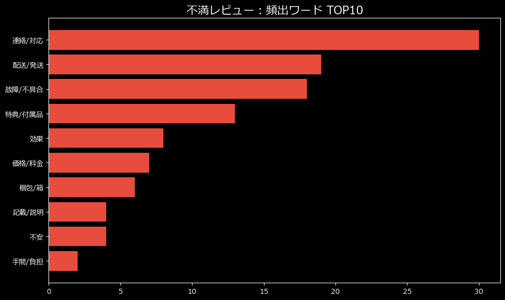 不満カテゴリの内訳を見ると、驚くべき事実が浮かび上がります。最大の不満要因は、製品そのものの性能ではなく、「配送/梱包(17件)」および「ショップ対応(14件)」に集中しているのです。