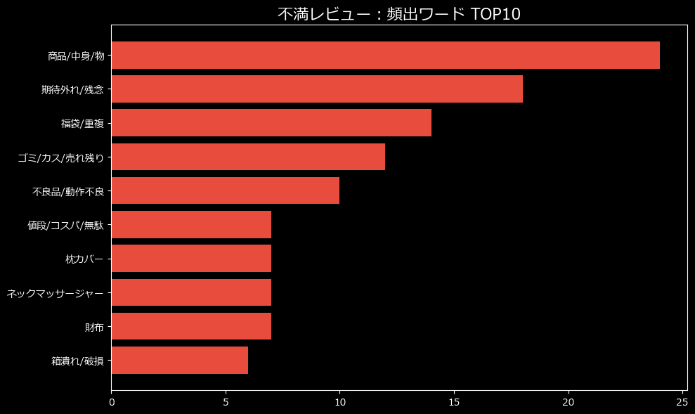 頻出単語ランキングを見ると、この商品の「闇」がより鮮明に浮かび上がってきます。第1位の「商品/中身/物(24回)」に続き、第2位にランクインしたのが「期待外れ/残念(18回)」。そして第4位には、どす恋まん花も目を疑うような「ゴミ/カス/売れ残り(12回)」という罵詈雑言が並んでいます。
